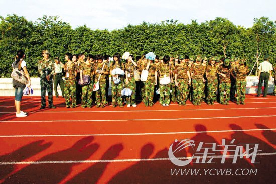 在廣外大學城校區今年軍訓中,老師一聲“把傘收起來”,90后們只好“上有政策下有對策”,書本、毛巾、書包,遮陽品各式各樣   本報記者 何奔 通訊員 吳魯 攝
