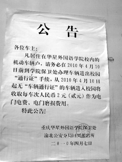 “我們住戶和學(xué)校完全是兩個獨(dú)立個體,學(xué)校根本沒有任何權(quán)力向我們收費(fèi)!奔易∪A星外國語學(xué)院家屬樓1單元5樓的住戶龍兵生說,本月7日,學(xué)校保衛(wèi)處在大門口通報欄處貼了一則收費(fèi)公告,要求凡居住在校內(nèi)有機(jī)動車輛的住戶務(wù)必在本月10號前到學(xué)院保衛(wèi)處辦理進(jìn)出“通行證”手續(xù),否則將向進(jìn)出校園的無“車輛通行證”的住戶,收取每人每車次2元,作為電門電費(fèi)、電門磨損費(fèi)用。