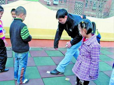 而在“玩”的時候,男女老師的不同就會顯現而出。據介紹,女老師一般是和孩子們玩一些如丟手絹之類活動量較小的游戲,而男老師就會帶著孩子們玩一些活動量較大的項目,比如競技賽跑等!澳欣蠋煄У陌嗌系暮⒆訒容^‘瘋’,這是我們愿意看到的,孩子充滿活力是件好事。”劉明陽說。