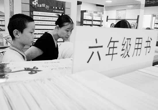 “今天來買書的家長已經少多了!苯逃龝暌幻ぷ魅藛T說,買書的高峰是8月31日和9月1日,“31日下午人最多,收銀臺前排隊的人都圍著書架繞了兩圈,足足有100多個。1日因為是周一,家長都要上班,所以晚上人最多!