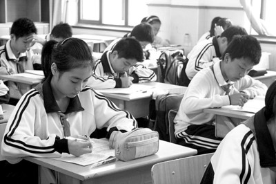 今天上午8:00,靜安區(qū)愛國學(xué)校七(3)班教室內(nèi),正在進(jìn)行期中考試。蔣秘文手中的試卷有些與眾不同,她答的是稍難些的B卷。在七(3)班,像小蔣一樣考B卷的還有4位同學(xué),其余近2/3學(xué)生主動選擇了難度適中的A卷。今年期中考試,該校初中年級推出創(chuàng)新做法,答哪一類卷,由學(xué)生自選,老師加以指導(dǎo)。學(xué)校在語、數(shù)、外三門功課中采取“分層考試”,分別設(shè)計(jì)了兩套難易程度不同的A、B卷,學(xué)生可根據(jù)自己的學(xué)習(xí)能力狀況自主選擇不同層面的試卷。