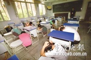 昨下午3時40分左右,考場正在模擬進行英語考試。當聽力內容剛播放不久,錄音突然被切斷,廣播里傳出主考的聲音:“由于發生輕微余震,請同學們原地躲避!”只見其中一個考室的30個學生迅速離開座位,雙手抱頭,在課桌之間的走道蹲下。監考老師仍然“堅守”講臺,密切觀察著考生的行為,并不斷地提醒道:“請不要交頭接耳,遵守考場秩序。”