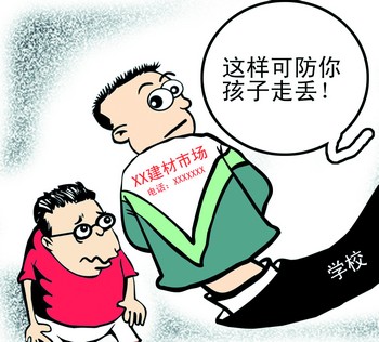 近日,杭州下沙金沙學校學生穿上了新校服,校服是家長掏錢買的,校服背后寫著大大的“杭州恒大建材市場”幾個字,還留了電話號碼。校長解釋稱,之所以印這個,一是為了防學生走丟,二是為了感謝建材市場對學校工作的支持,電話號碼是校長辦公室的。(10月29日《都市快報》)