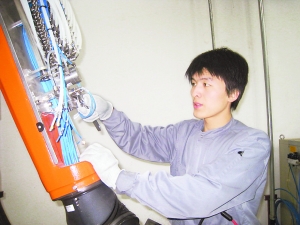 車間的流水線突然發出報警,機器人隨之停止工作。4月10日上午10時,楊雪峰正坐在中控室監視流水線運轉,面前的紅燈閃個不停。他拎起工具包,和師傅跑到報警機器前。一個兩米多高的機器人“罷工”了!斑@個機器人是專給車身噴漆的,它一停,整個流水線就不能運轉了!睏钛┓蹇刂谱⌒睦锏木o張,緊握扳手的右手有些微微顫抖,爬上流水線和師傅一起查找原因,“進廠后就沒修過機器人這個大家伙,在師傅身后學了半年,這回終于派上用場了!