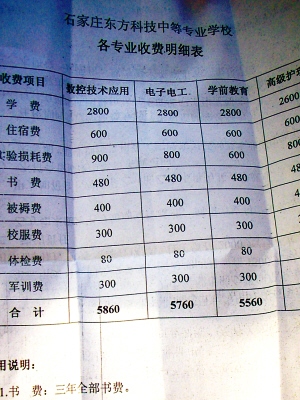 如果學(xué)生想自己找實習(xí)單位,就要交3000元錢。其中1000元是注冊費,2000元是伙食費!拔覀兪桥c石家莊協(xié)和醫(yī)學(xué)院聯(lián)合辦學(xué)的,發(fā)的是那所學(xué)校的畢業(yè)證,注冊什么的都需要錢,這個錢就得學(xué)生來出!边@位老師說,從去年5月份開始,學(xué)校的食堂就對學(xué)生和教職工免費開放了。小張去年7月從廣東打工回來,暑假后來上學(xué),從9月到現(xiàn)在,在學(xué)校免費吃了7個月的飯,按每月300元算,是2100元,學(xué)校收2000元是合適的。