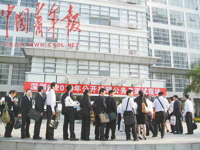 23歲的鐘文去年從深圳大學法學專業畢業,她報考的是深圳市坪山新區執法員的職位。和鐘文一樣來參加面試的考生有1036人,是從34545名考生中通過筆試篩選出來的“幸運兒”。今天,他們將經歷又一次殘酷競爭——只有346人能最終進入深圳的聘任制公務員隊伍。