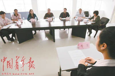 早上8點半,一百多名考官已經在考場三樓的階梯教室等待抽簽。此時的一樓,1000多名考生已經排隊簽名進場候考。每個人面試的時間都是12分鐘,由于面試成績在總成績中占40%,因此,這12分鐘將在很大程度上決定面試者的未來。