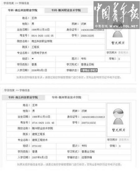 從學(xué)籍科老師處知道自己的身份可能被盜用的消息后,王帥登錄中國高等教育學(xué)生信息網(wǎng)查詢。他發(fā)現(xiàn)自己的身份下有兩個(gè)學(xué)籍信息,一個(gè)是自己2007年入學(xué)的隨州職業(yè)技術(shù)學(xué)院,另一個(gè)則顯示為:2006年9月1日入學(xué)商丘科技職業(yè)學(xué)院工程系應(yīng)用電子技術(shù)專業(yè),學(xué)制三年專科,學(xué)籍狀態(tài)為已畢業(yè)。后者的姓名、出生日期、身份證等信息均與自己相同,考生號則為自己第一年參加高考的準(zhǔn)考證號。兩個(gè)學(xué)籍信息均沒有照片。
