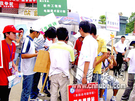 記者從其中一處咨詢點起身后,沒走上幾步,立即圍上四五名招生人員,爭相介紹自己的學校,均稱自己是重點大學的正規自考招生。其中一名招生人員向記者推介:“他們有的雖然掛個大學的牌子,其實是在外面租房子教學,而我們是在校本部辦學。”面對圍在身邊的招生人員,記者表示,要單獨考慮對比一下再決定,但仍有3人緊跟不舍。他們表示,高考分數并不重要,兩三百分都可以報名。