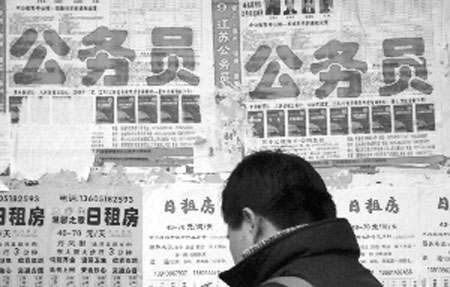 昨天,記者從南京幾所高校校內(nèi)信息公告欄里看到,公務(wù)員考試輔導(dǎo)班大有風頭蓋過考研輔導(dǎo)班的趨勢,連學生宿舍樓門口、餐廳門口公告欄上,也張貼著公務(wù)員考試輔導(dǎo)的招生海報。