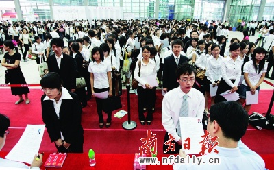 當日,深圳大學(xué)2009屆法學(xué)專業(yè)學(xué)生小楊早上7時30分就和同學(xué)坐車趕到了會展中心,本以為能“趕個早集”,哪知道會展中心門口早已排滿了幾萬名從全國各地趕來的畢業(yè)生。等到8時30分會展中心提早開門時,弱小的小楊花了很大的力氣才“好不容易”被“推”進了會場。然后,她花了近2個小時把整個會場轉(zhuǎn)了一遍,雖物色到了符合自己要求的企業(yè),但是因為人太多,她沒有投出一份簡歷。