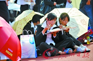 廣東44場(chǎng)畢業(yè)生招聘會(huì)昨日進(jìn)入第四場(chǎng)外語(yǔ)外貿(mào)、營(yíng)銷管理專場(chǎng),共有90多家企業(yè)前來(lái)“攬才”,提供1300多個(gè)崗位,吸引近1.5萬(wàn)學(xué)生來(lái)應(yīng)聘。因手機(jī)無(wú)法接通,現(xiàn)場(chǎng)學(xué)生頻繁通過(guò)廣播“尋人”。女學(xué)生為減少穿高跟鞋排隊(duì)的辛苦,干脆以套裝配波鞋等待面試。