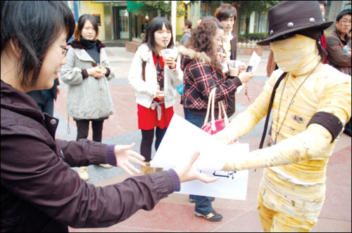 扮“木乃伊”路邊發簡歷