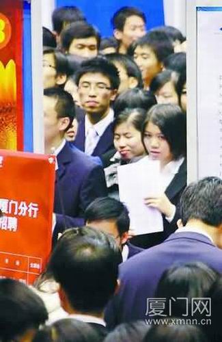 當日在廈大召開的畢業生招聘會,是廈大每年為自己的畢業生舉辦的,不過,幾乎省內的大學都有人趕去參加,使得廈大這一年一度的招聘會首次實行門禁——依照人流量分時段放人入場,有的畢業生花了一小時才遞上一份簡歷。
