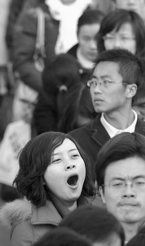 女生一邊等待進場一邊打呵欠