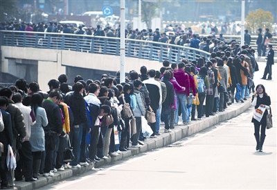 20 日,“湖北省2009年新春大型人才招聘會”在華中科技大學光谷體育館舉辦。這場招聘會是2009年春節后首場針對大學生的招聘會,近4萬名求職者擁向會場,隊伍最長時有3公里。上圖:當天下午1時20分,一些學生投完簡歷走出體育館,而門外還聚集著大量等待進場的學生。