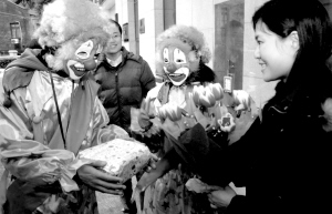 頭戴紅鼻頭鬈發(fā)的小丑面具,身穿一套連體的彩裝寬松衣……昨天下午,當(dāng)手捧鮮花禮品、這身打扮的袁楓和王洪福從威寧路一乘上地鐵二號(hào)線,許多乘客還以為又巧遇“雷人”了。其實(shí)他們都是大學(xué)生快遞員,正在去送祝福快遞的途中。