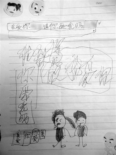 “我愛你王××,你愛我嗎!”從筆記本撕下的紙張上端整齊地寫著一行字,字被框了起來,比較醒目。紙張下端,畫著一個獨辮子女孩和一個男孩牽著手,一旁標注著“我愛你,你愛我”。