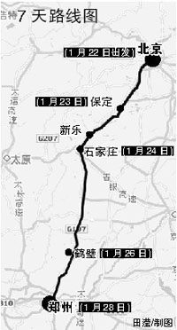 由于沒有買到回老家鄭州的火車票,北航的大二學(xué)生高富松決定騎自行車回家。他1月22日從北京出發(fā),歷時(shí)7天抵家,目睹了冰雪對(duì)沿途居民的影響。昨天,高富松興奮地告訴記者,雖然路上經(jīng)歷了不少困難,但堅(jiān)持到最后的精神讓自己平安到家,而且這次經(jīng)歷也考驗(yàn)了自己的耐力。