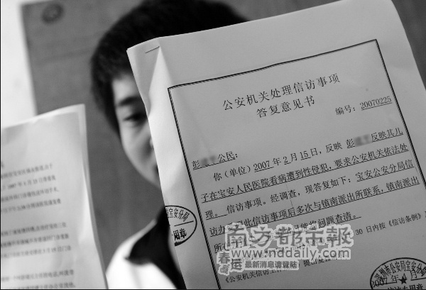 鎮(zhèn)南派出所通過寶安區(qū)公安分局對(duì)記者表示,這件事開始移送給檢察院時(shí)因?yàn)樽C據(jù)不足,而被檢察院發(fā)回繼續(xù)取證,目前還在進(jìn)一步取證中。而彭先生表示,派出所跟他說的是目前該案的材料已經(jīng)移交給寶安分局法制科,再由法制科送交區(qū)檢察院。寶安區(qū)檢察院一位檢察官表示,目前他們只有鎮(zhèn)南派出所送來的部分材料,而完整的材料還沒有移送過來,因此目前尚不能對(duì)該事件進(jìn)行定性或起訴。