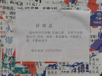 在東北師范大學就讀的郭同學告訴記者,前不久她在宿舍樓下的留言板上也發現了一張類似內容的廣告單,上面印有“意外懷孕不用愁,XX醫院來解憂,采用超導可視無痛人流,不損傷正常組織……”郭同學說:“很多女同學看到這樣的廣告都臉紅了,即便現在社會比以前開放了,但這種廣告也不該出現在校園里吧。”