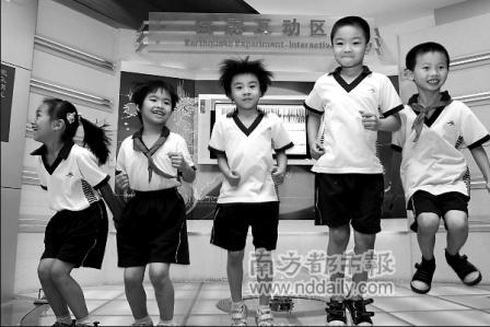 省地震科普館“試震互動區”內,孩子們跳起體驗“震級”。記者姬東攝