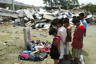 “5·12 ”地震發(fā)生后,四川德陽什邡市一名從廢墟中爬出來的13歲小孩,曾英勇救出3名同學(xué)和一名懷孕教師。昨天,該少年來到學(xué)校倒塌的校舍里刨出10余個書包,將它們整整齊齊地擺放在廢墟旁邊一塊寫有“奠”字的碑前,然后與其他同學(xué)一道默哀3分鐘,以此方式來陪伴遇難的同學(xué)一起過兒童節(jié)。