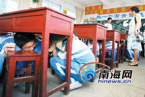 11日下午,海口市地震設(shè)防中心副主任、全國(guó)十佳少先隊(duì)志愿者輔導(dǎo)員何照全向海口一中初中部的老師們進(jìn)行抗震培訓(xùn),在記者及海南廣播電視臺(tái)音樂廣播節(jié)目部副主任衛(wèi)華的建議下,何照全隨機(jī)指導(dǎo)初一某班學(xué)生進(jìn)行防震演習(xí)。他先向?qū)W生們講解了防震的基本常識(shí):如果在學(xué)校教室上課,從顛簸與搖晃中斷定是地震,老師應(yīng)立即命令大家不要慌,迅速蹲下來躲在桌子下,最好再拿書包護(hù)著頭部。待地震停止時(shí),老師立刻組織學(xué)生們有秩序地撤離,到操場(chǎng)上集合。