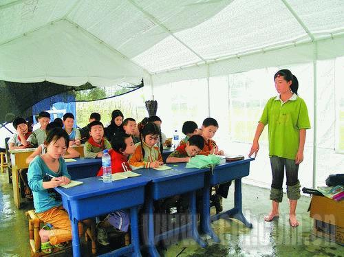 18日下午,綿竹土門鎮雙龍村帳篷小學副校長黃忠波拿起喊話筒吼著:“上課了!上課了!”大樹下30多名學生頓時停止打鬧,走進帳篷上課。19歲的師專一年級學生柳玉玲給他們講起了唐詩《贈汪倫》。