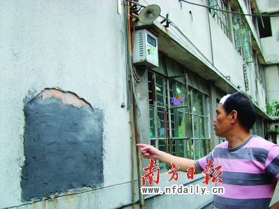 紅星幼兒園位于禪城區福寧路上,屬祖廟東華里拆遷范圍的拆遷戶。昨日上午記者趕到該幼兒園時,由于電線門窗等都遭到破壞,幼兒園正準備搬遷到其他地方。記者發現,該幼兒園的后墻上有一個約1平方米大小的新修補的墻壁,與其它周圍墻壁顏色不同。而該幼兒園主管梁先生氣憤地說,這個新修補的地方原本是一扇窗戶,前天上午拾荒者就是砸爛該窗戶進入院內偷竊的,所以后來用磚和水泥將該處封了。