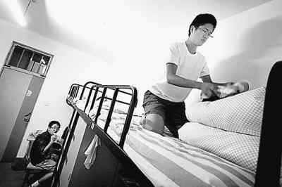 王佳明(右)在收拾自己的床鋪。