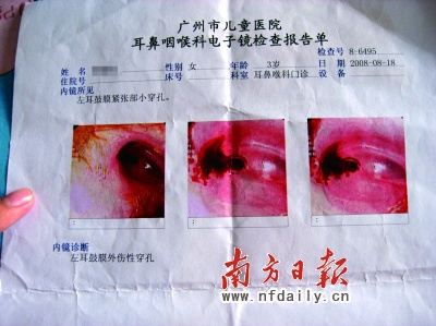 8月18日,何女士帶著耳痛未減的小賢復(fù)診,經(jīng)過電子鏡檢查,診斷為左耳鼓膜外傷性穿孔!袄锩嬉呀(jīng)破了一個(gè)口,孔里和四周充滿紅色的血漿。醫(yī)生說聽力降低了20-30分貝!焙闻恐钢(yàn)單,一臉憂心忡忡。