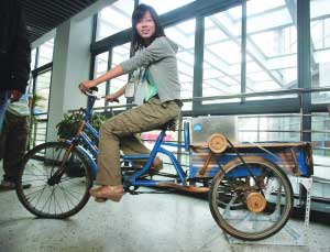 “快看,一邊蹬一邊就能洗衣服了。”一輛三輪車被參觀的學(xué)生團(tuán)團(tuán)圍住。這可不是一輛普通的車,它可是集洗衣、健身于一體的新節(jié)能“產(chǎn)品”。