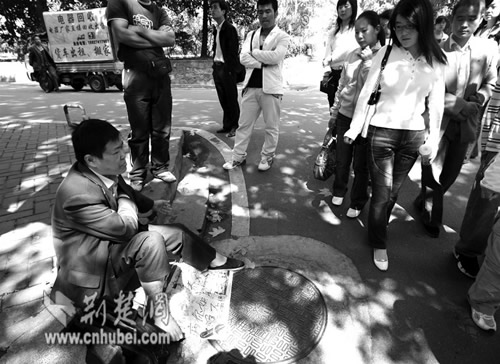 昨日上午10時許,記者趕到華中師范大學,在距離東門不遠的一處路口,一名男子在地上擺著一張報紙,上面用黑筆寫著:“××學院的×××,養父生病,你如此狠心,不管不問……”,吸引了許多學生圍觀(如圖)。