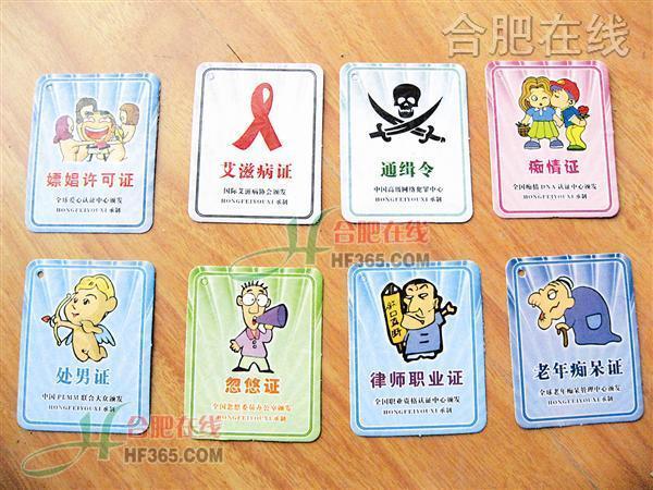 合肥市永紅路小學(xué)五年級的女生小張最近比較煩,她說:“天天有男生追著我們女生發(fā)‘恐龍證’,我已經(jīng)收到了4張證書,真是煩死了。”原來,近日一種惡搞證件在他們學(xué)校悄悄流行開來,內(nèi)容包括“艾滋病證”、“光棍證”、“老年癡呆證”等。“好多同學(xué)到學(xué)校門口的小店里買了這些證回來亂發(fā),誰要調(diào)皮就給他一個(gè)‘流氓證’。”小張如是說。一位來學(xué)校接孩子的家長氣憤地告訴記者:“我兒子居然有個(gè)‘泡妞證’,孩子們年齡小,對很多事情還處于懵懂狀態(tài),校園里出現(xiàn)這種不良物品,肯定會(huì)影響他們的身心健康。”很多家長對此憂心忡忡,擔(dān)心孩子學(xué)壞,同時(shí)他們也認(rèn)為商家售賣如此低俗的惡搞證件是一種不負(fù)責(zé)的行為。在采訪中記者了解到,還有一些父母對孩子是否玩這種證件并不知情,都表示晚上回去翻翻孩子的書包。一位孩子家長在看到證件時(shí)驚訝地瞪大了眼睛,直說:“太恐怖了,太恐怖了……”