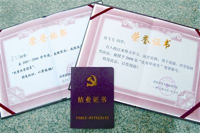 據悉,吳飛飛在校三年成績優秀,今年臨畢業前被學校評為“優秀畢業生”。吳的同學說,優秀畢業生居然拿不到畢業證,真荒唐。