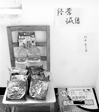 開業次日,記者在現場看到:一張小凳上擺著9袋方便面和礦泉水,旁邊是一個簡易投幣箱。
