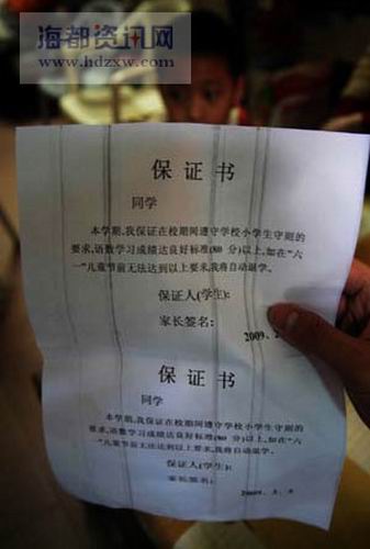 昨日下午5時,記者在石獅市區找到小強的家人,小強的爸爸王先生(化名)告訴記者,小強今年11歲,在石獅塔前小學四年級1班就讀。說著,王先生拿出校方的保證書,上面寫著“本學期,我保證在校期間遵守學校小學生守則的要求,語數學習成績達良好標準(80分)以上,如在六一兒童節前無法達到以上要求,我將自動退學”,后面還有保證人(學生)和家長簽名,時間為2月5日,但沒落款。