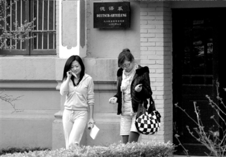 昨天下午4點46分,王亭亭站在北外的校門口,身邊跟隨著一位衣著時尚、戴著墨鏡的女士。幾個北外的學(xué)生當(dāng)即認(rèn)出了她,王亭亭身穿的粉色套裝和博客上的照片一模一樣,照片中染色的卷發(fā)已經(jīng)拉直并且染成黑色,表情有些冷漠,并不顧及旁人的目光,低頭直接走進(jìn)離北外校門不足200米的德語系辦公樓。