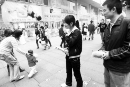 40分鐘后,9名學(xué)生來到觀音橋。10時(shí)許,張玉琴鼓足勇氣走向一家婚紗店,老板給了她一疊宣傳冊(cè),“不管用何種方法,只要是能找夠15名顧客來店咨詢,就可得到30元錢。”這是這個(gè)團(tuán)隊(duì)第一個(gè)找到“工作”的人。