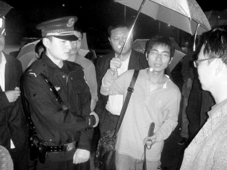 “下午2點20分左右,距比賽開始僅僅剩下40分鐘了,賽場內前奏的音樂已經響起,這時‘米黃外套’回來終于告訴大家,由于此次用的是賽車場發給上海市中學生的團體票,大學生不能入場,所以今天可能‘沒戲了’。此時九陽旅行社的洪經理看起來也焦頭爛額,他沒有打傘,站在大雨里,水珠不斷順著頭發流下。”