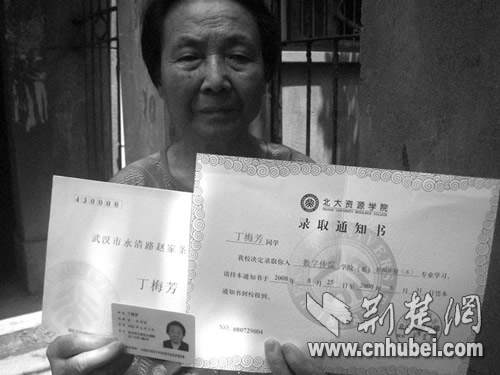 昨日(8月5日,下同)上午,家住漢口永清街趙家條的丁梅芳老太向記者展示了這封標(biāo)稱“北大資源學(xué)院(以下簡稱北資院)”,在8月3日寄達(dá)的錄取通知書。記者看到,該錄取通知書上寫著:“丁梅芳同學(xué),我校決定錄取你入數(shù)字傳媒學(xué)院系新聞傳播(本)專業(yè)學(xué)習(xí),請持本通知書于2008年8月25日……到校報到。”