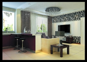 此方案為一居室戶型,該戶型的居住人群多為年輕人,因此方案為現(xiàn)代簡(jiǎn)約風(fēng)格。將廚房完全敞開,與客廳連在一起,采用島臺(tái)的餐桌既節(jié)省空間,又時(shí)尚大方,使用水晶簾將沙發(fā)與廚房隔開,具有通透性。在顏色上采用米黃色的墻面,與黑白搭配的壁紙和紅色烤漆櫥柜結(jié)合,時(shí)尚感極強(qiáng)。(盧柳兆)
