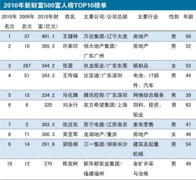 上周末,《新財富》雜志發布2010年“新財富500富人榜”,上榜富人財富總額為28756.5億元,較2009年增長76.6%。萬達集團王健林以401.1億元位居首富;許家印以385.3億元位列第二;張茵以344.2億元位列第三。