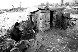 昨日中午,青磚窩棚在廢墟的白雪包圍下,冒起炊煙,崔存玲在一個缸子里烤起饅頭,準備著和丈夫的午飯。