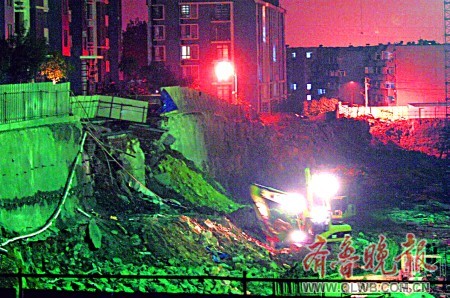 晚8點左右,記者趕到泉景天沅·秀園新建樓盤施工現場,這處工地南側緊挨著王女士居住的樓房。地基已經挖到十幾米深,如刀切斧剁一般齊刷刷到底,橫截面上有一些用來加固土層防止坍塌的錨桿。根據記者目測,坍塌的地方長度約10米,土層從上到下一落到底(上圖)。為防止情況繼續惡化,施工方已經采取了措施。兩輛渣土車正從挖出的土堆上往坍塌的地基處運送土方,而兩臺挖掘機則把運來的土方往坍塌處回填反壓。