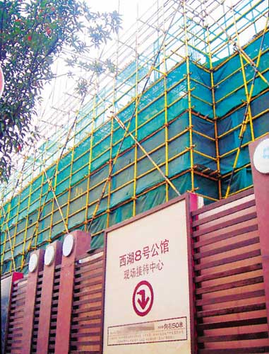 在吳山廣場(chǎng)邊上的四宜路上,記者找到了這個(gè)占地僅5980平方米的樓盤。因?yàn)榕R近西湖,有限高規(guī)定,所以在一片二手房簇?fù)碇械奈骱?號(hào)公館并不是那么顯眼。整個(gè)樓盤僅有兩幢房子,而且中間還隔著一幢破舊的樓房,看起來,樓盤的小景觀并不是特別理想。