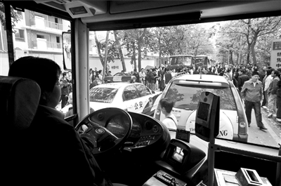 記者發(fā)現(xiàn),現(xiàn)場有9輛31路公交車被堵無法前行,公交司機們?nèi)齼蓛傻鼐墼诼愤吜奶臁R幻跣账緳C說,他已被堵近1小時,但因車隊未允許調(diào)頭返隊,他只好原地等待。當被問及如何處理車上乘客時,他說,由于等待時間過長,乘客只能下車步行離開此地。