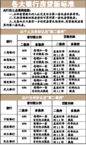 認(rèn)定第二套住房,關(guān)鍵是看計算單位是家庭還是個人。在這方面,四大銀行和其他商業(yè)銀行及分支機構(gòu)已經(jīng)出現(xiàn)分歧。央行正聯(lián)合四大商業(yè)銀行討論房貸“第二套房”的核定標(biāo)準(zhǔn),預(yù)計近日將確立統(tǒng)一的“第二套房”認(rèn)定標(biāo)準(zhǔn)。中國建設(shè)銀行已經(jīng)明確了“第二套房”的認(rèn)定標(biāo)準(zhǔn)是以“戶”為單位。不出意外的話,這也將是其他三大商業(yè)銀行的選擇。目前華夏、光大等銀行則以個人為單位界定第二套房。