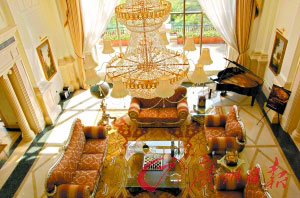 據介紹,僅僅一些大宅櫥窗柜內、茶幾上、西餐廳里一些餐具飾品的擺放總價值便達50余萬元。在主廳內,巨型水晶吊燈正下方擺放的長形餐桌上,一對看似普通的玻璃杯便價值近2000元,一個小小的麥片碗也需929元。而價值2萬余元的300年干邑擱置在茶幾上。連在客廳外側長廊上隨意擺放的“夏威夷之夢”雕塑也出自名家之手,全球限量29件,價值近12萬6千元。